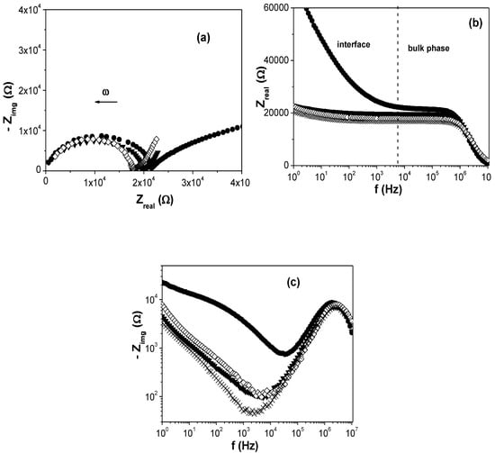 where ω = 2πf is the angular frequency. The analysis of the impedance data was performed by using the Nyquist plot in the complex plane (−Zimg versus Zreal), where a parallel resistance–capacitance circuit (RC) corresponds to a semi-circle with intercepts on the Zreal axis at R∞ (ω→∞) and Ro (ω→0), with R = 0.5(Ro–R∞) being the resistance of the system, while the maximum of the semi-circle occurs at such a frequency that ωRC = 1 []. This description is valid for systems with a unique relaxation time (homogeneous systems), while a depressed semi-circle due to a distribution of relaxation times is obtained in the case of non-homogeneous systems [,].
