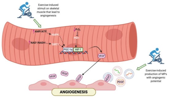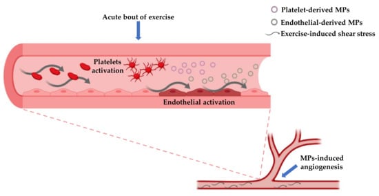 In the last years it was evidenced that physical exercise induces modification of the MPs release into the bloodstream [93]. These EVs carry various molecules important for the tissues’ crosstalk during and post exercise [94,95] and can be also a cargo of soluble factors involved in endothelial cell proliferation, migration, and adhesion. This results in the generation of new vessels in response to exercise.