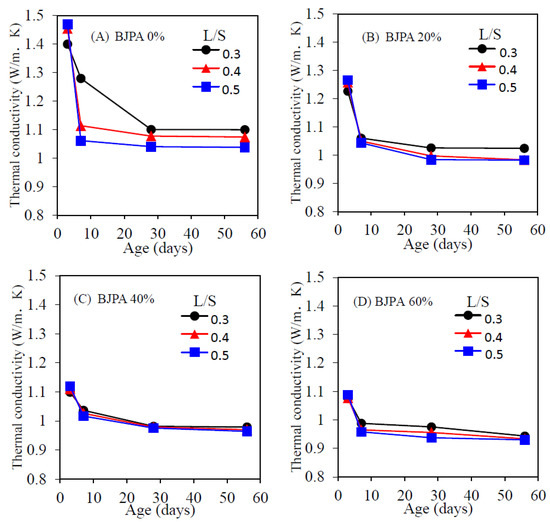 Figure 8 shows that, under different BJPA-substitution ratios as well as L/Ss of 0.3, 0.4 and 0.5, the thermal conductivity coefficient decreased with an increase in curing age: the thermal conductivity coefficient decreased by 21.4–9.2%, 26.1–10.5% and 29.3–13.5%, respectively, when the specimen progressed from 3 to 56 days old. The results indicated a drop in the thermal conductivity coefficient following a rise in the L/S because the latter increased the volume of the alkali activator within the specimen, which resulted in moisture reduction and more pores. The thermal conductivity coefficient was influenced by L/S, BJPA-substitution ratio and specimen age: a rise in the BJPA-substitution ratio reduced the thermal conductivity coefficient because BJPA had lower activity and was unable to completely react with the alkaline solution, leading to a less dense and more porous internal structure. Consequently, the thermal conductivity coefficient was reduced, which in turn enhanced the thermal insulation and heat resistance of the specimen.