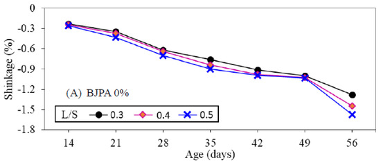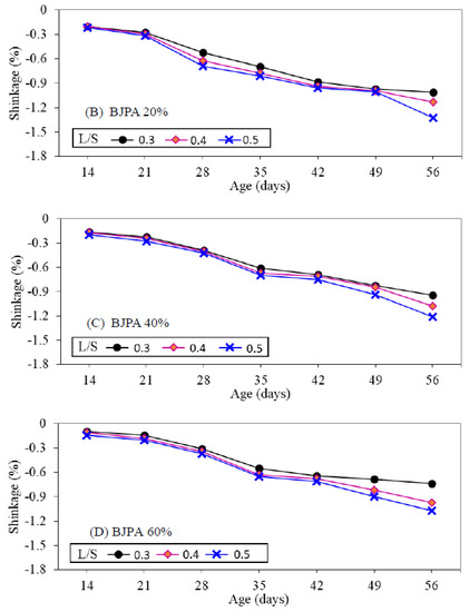 This study measured the change in length and shrinkage of the BJPA–GGBFS composite geopolymer to determine its volume stability. Figure 9 indicates that an increase in the BJPA-substitution ratio led to a significant decrease in the shrinkage of the composite geopolymer. The less formation of reaction product due to less reactive BJPA replacement leading to less shrinkage. Thus, the shrinkage of the composite geopolymer decreased following a rise in the BJPA-substitution ratio.