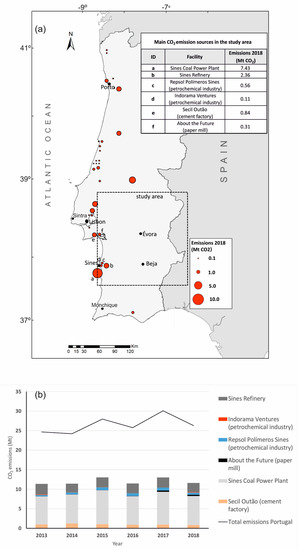 According to the European Union carbon market database (EU ETS), in 2018, the Portuguese CO2 emissions from the industrial and power sectors amounted to 26.2 Mt CO2 [7], with the most important emissions cluster located in southern Portugal, extending from Setúbal to the Sines industrial area, being responsible for 44% of all emissions in the country (Figure 1a). Although the main point source in the region, the Sines Coal Power Plant, is to be decommissioned in 2023, the remaining sources will account for more than 30% of all emissions from industrial sources (Figure 1b). Furthermore, the socioeconomic relevance of the industry to the region imposes the need to seek alternatives to decarbonization in the region.