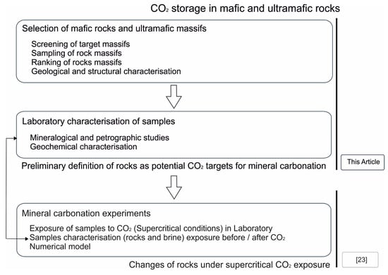 Figure 2 depicts the overall approach to define and characterize the rock massifs, the techniques applied, and the laboratory experiments, which are described in the second article [23] to establish the potential for mineral carbonation.