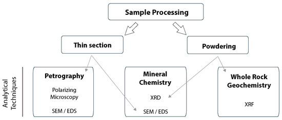 The samples collected in the first field trip were processed in thin sections for petrography and mineral chemistry analysis and powdered for X-ray diffraction (XRD) and X-ray fluorescence (XRF) analysis (Figure 3).