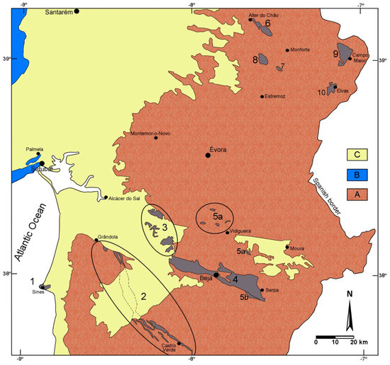 Location of the studied units: (A) Variscan basement; (B) Mesozoic cover; (C) Cenozoic cover; (1) Sines massif; (2) diabases of the Iberian Pyrite Belt; (3) gabbros of the Torrão‒Odivelas region; (4) Beja gabbros; (5) ophiolitic sequences: (a) internal ophiolitic sequences; (b) Beja‒Acebuches ophiolitic complex; (6) Alter do Chão/Cabeço de Vide massif; (7) Veiros massif; (8) Vale de Maceiras massif; (9) Campo Maior massif; (10) Elvas massif.