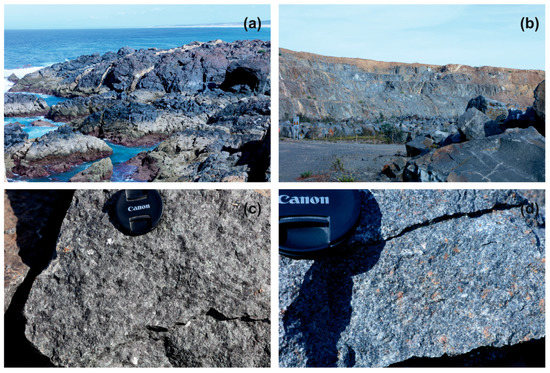 Two coarse-grained ultramafic to mafic samples from the Sines massif were collected for laboratory characterization and mineral carbonation experiments—a melanocratic cumulate gabbro at a cliff near Praia do Norte (Figure 5 and Figure 6c) and a gabbro-diorite at Montes de Chãos quarry (Figure 5 and Figure 6d).