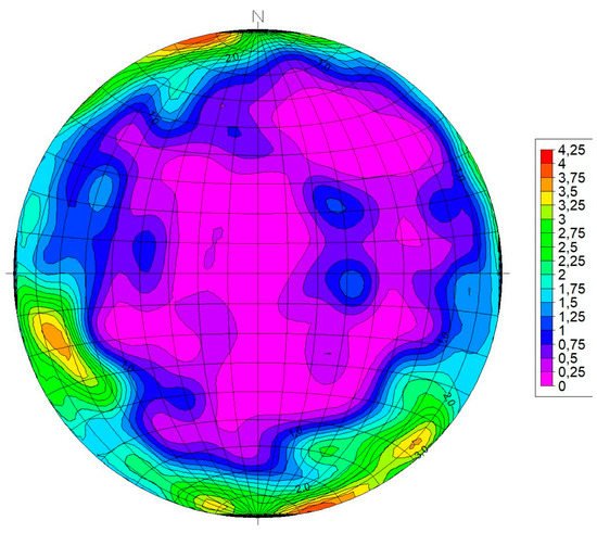 In the field, the observed rocks of the Sines massif displayed very low primary porosity, as is expected for plutonic rocks. Therefore, the characterization of the fracture patterns is fundamental for an indirect assessment of the permeability of the massif and, consequently, for the viability of the gabbro and diorite being used for in situ mineral carbonation. The exposure at the walls of Montes de Chãos quarry is the best place to analyze the fracture patterns of the Sines massif. The obtained fracturing density diagram poles is shown in Figure 7.