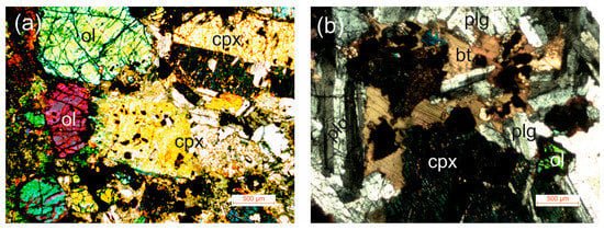 Microphotographs of (a) cumulate gabbro and (b) gabbro-diorite under polarized light microscope. ol—olivine, cpx—clinopyroxene, plg—plagioclase, bt—biotite.