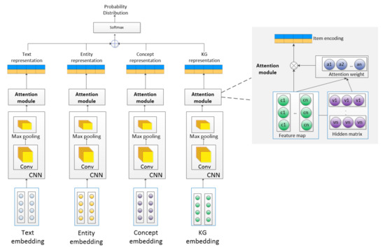 Owing to the convenience of integrating extra knowledge into neural networks, deep learning-based short text representation forms the common method for short text classification. Among a majority of neural network types, Kim [3] first introduced CNN to the text classification. CNN is good at extracting local features through the convolution layer. To capture the informative information from the text, Vaswani et al. [4] proposed an attention network in NLP. The improvement of combining knowledge bases for downstream deep short text classification tasks has been verified in recent research [5,6,7]. Although such methods gain more accurate short text representations, limitations exist such as on the way of combining extra knowledge bases, that is, they still suffer from making full use of external knowledge bases. They consider only one aspect (only the entity or concept information) from knowledge bases to enrich the short text representation.