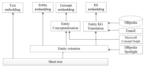 The goal of this module is to retrieve the relevant entities, concepts, knowledge graphs from the short text. Firstly, we extract the entities from short text. Entity annotation and linkage are the foundation for our model. Some recently proposed annotation and linking tools, such as the DBpedia Spotlight, TagMe, and wikify!, can satisfy our need here. In this work, we choose DBpedia as our knowledge base and DBpedia Spotlight as our annotation tool. With the DBpedia Spotlight, we can link the extracted named entities in the input short text to the DBpedia resources [19]. Secondly, we obtain relevant concept for the extracted entities. ConceptNet [20] and Microsoft Concept Graph [21,22,23,24,25,26,27] are the two widely used toolkits to obtain the concept of an object. We choose to use the Microsoft Concept Graph, which has 5.3 million concepts learned from billions of website pages and search logs for the conceptualization. Finally, the knowledge graph for the relevant entities can be obtained through DBpedia. A typical knowledge graph is a collection of relationship triples (h,r,t) in which h represents head, r represents relation and t represents tail. The structural knowledge graph information needs to be transformed to the embedding. There are many transform methods that can learn the low-dimensional vector spaces from the knowledge graph. The comparison of some widely-used methods, like TransE, TransD, TransH and TransR, can be found in Reference [28]. In our model, we choose to use TransE as the knowledge graph embedding method.