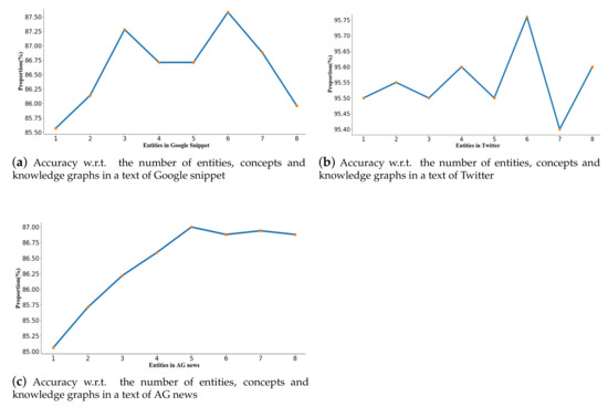In this section, we investigate how different numbers of entities affect the performance of our model. We use the different numbers of entities in the set [1,2,3,4,5,6,7,8] on the three datasets. The result is demonstrated in Figure 4. The results show that the best performance is associated with six entities in Google Snippet and Twitter but five entities in AG news. However, the performance does not increase when the entity number further increases. This may be because, when the majority of entities are involved, our model learns the informative representation from the entities. The learned informative entities benefit the classification result.