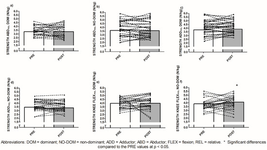 No statistical differences were seen in relative isometric hip ABD strength in the dominant (+2.42%, p = 0.864, ES [C.I.] = 0.01 [−0.08, 0.11]) (Figure 1a) and non-dominant limb (−1.46%, p = 0.834, ES [C.I.] = −0.02 [−0.12, 0.07]) (Figure 1b); nor in the relative isometric hip ADD strength in the dominant(−2.10%, p = 0.399, ES [C.I.] = 0.10 [0.00, 0.19]) (Figure 1c) and non-dominant limb (+3.38%, p = 0.349, ES [C.I.] = 0.11 [0.02, 0.21]) (Figure 1d). In addition, no differences were obtained in ADD/ABD strength ratios in dominant (1.14 vs. 1.19, p = 0.220, ES [C.I.] = 0.28 [0.19–0.37]) and non-dominant limbs (0.98 vs. 0.96, p = 0.600, ES [C.I.] = 0.14 [0.05–0.24]) when comparing them pre and post-match. However, for isometric knee flexion strength, statistical differences were obtained in the non-dominant limb (7.0%, p = 0.047; ES [C.I.] = 0.29 [0.20, 0.38]) (Figure 1f) but no differences were reported in the dominant limb (0.1%, p = 0.983; ES [C.I.] = 0.11 [0.02, 0.21]) (Figure 1f). Finally, neuromuscular fatigue was measured by a countermovement jump test after match-play (23.0 ± 4.9 vs. 20.5 ± 6.6 cm, p = 0.008, ES [C.I.] = 0.44 [0.34, 0.53]).