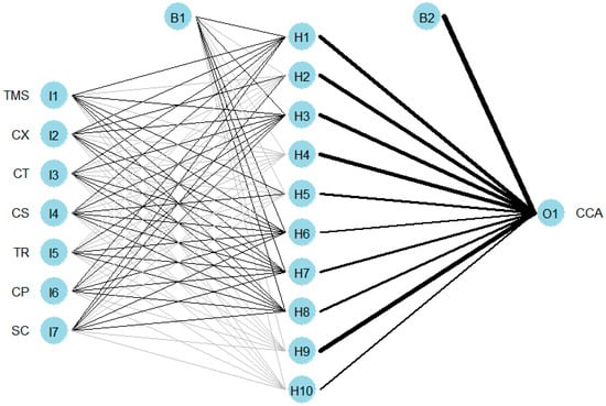 The neural network can be explained as a significant parallel distributed processor, consisting of simple processing units that are naturally inclined to store experimental knowledge and to provide access for use [117]. Moreover, a neural network is considered to be similar to the human brain and is capable of attaining new knowledge from its surroundings by implementing the learning process. Then, the synaptic weights store this acquired knowledge [117]. Following this, the learning algorithm uses sample data for altering the synaptic weights of the neural network in an orderly fashion in order to achieve the design objective [117]. Moreover, the neural network offers numerous benefits than traditional statistical methods. Such benefits include non-linear and linear neural networks to enable the assessment of non-compensatory decision processes, and it can help attain the input and output mapping without requiring specific distribution concerning the output or input [118]. Furthermore, the adaptivity of the neural network suggests that it is able to address the data generation process in terms of structural changes and that it is not difficult to re-train it according to environmental changes [118,119]. It has also been noted that neural networks surpass traditional compensatory models such as multiple, discriminant, and logistic regression analyses [118,119]. However, despite the fact that neural network has been implemented in studies in different fields such as economics [120], customer loyalty [121], wearable healthcare devices [122], and consumer choice [119,123], few studies have focused on its information systems applications [124]. Hence, the present study will first utilize PLS-SEM to determine the constructs that have strong relationships with the adoption of CC in HEIs, and then implement the non-compensatory neural network model for foreseeing the adoption of CC in HEIs according to the critical adoption variables.