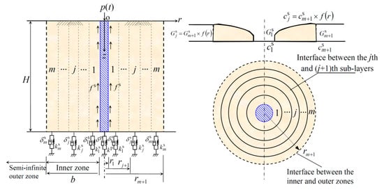 Figure 1 shows a new mechanical model for the longitudinal vibration of an interaction system including soil and a solid pile. H, , , and represent the length, diameter, density, elastic modulus and Poisson’s ratio, respectively, of a floating solid pile. The surrounding soil is composed of two parts, i.e., two zones: an inner disturbed annular zone and a semi-infinite outer undisturbed zone of surrounding soil. The inner zone of surrounding soil can be further divided into m annular sub-layers. The radial thickness and radius of the inner disturbed zone are b and , respectively. is the outer radius of the jth annular sub-layer. , , , and denote the density, Lame constant, shear modulus, elastic modulus and viscous coefficient, respectively, of the jth disturbed sub-layer. The mechanical constants of the viscoelastic supports beneath the pile toe and surrounding soil are , and , , respectively. The uniformly distributed excitation pressure is . Besides this, the following assumptions are specified in the proposed mechanical model: