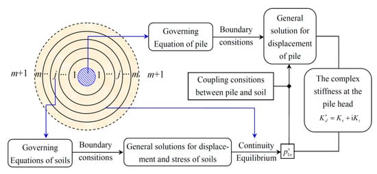 The mathematical implementation for the derivation procedure of pile–soil dynamic vibration is shown in Figure 2.