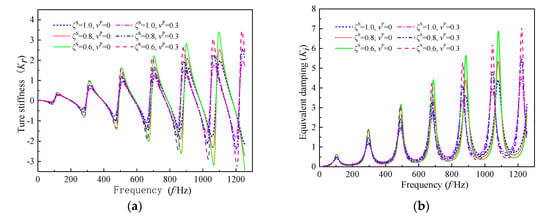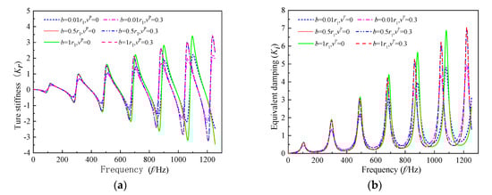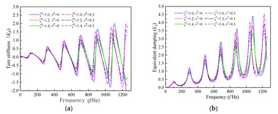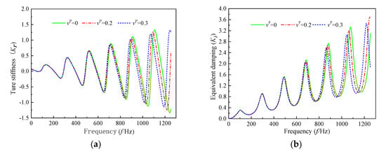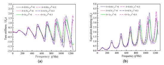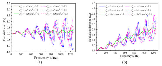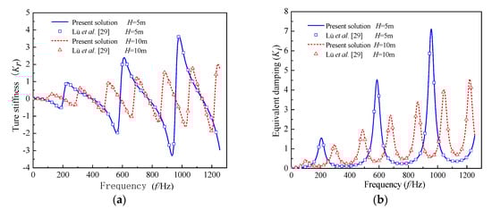 Comparison between the present solution () and the solution of Lü et al. [29]: (a) true stiffness; (b) equivalent damping.