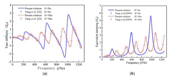 Comparison between the present solution ( and ) and the results of Yang et al. [22]: (a) true stiffness; (b) equivalent damping.