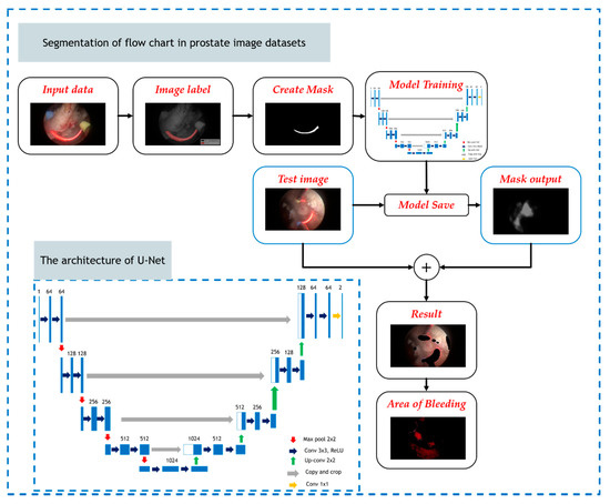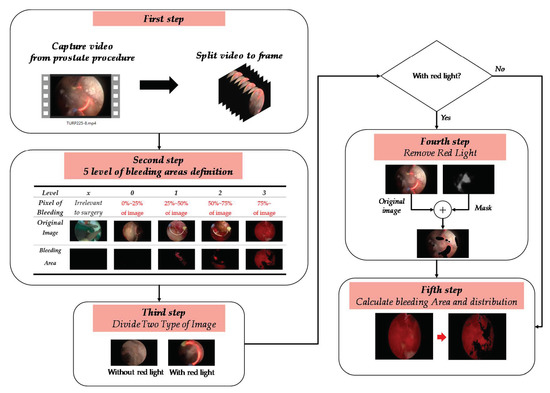 Automatic image analysis provides a helpful tool to support the clinician and speed up the detection process. Thus, an automatic computer-aided technique has been increasingly used to reduce the burden on physicians. In this study, we utilized the deep learning techniques, instead of the traditional method, to automatically classify bleeding regions. The proposed flowchart is shown in Figure 1. The prepared work included five stages. In the first stage, the captured color videos from the TURP surgery were split into 26,025 frames for analysis. In the second stage, the indicator of the four levels of bleeding areas was defined by a pixel area ratio for the classification of blood loss. It is complex for experienced physicians to determine the color space between blood and red light. Therefore, this study integrated two deep learning models to automatically solve this problem. In the third stage, because it required a detection time to filter the red light image pattern, we utilized the ResNet-50 model to recognize the red light pattern appearing in the framed images of surgery. In the fourth stage, the extraction and removal of the areas with the red light pattern were implemented using the U-Net model. In the fifth stage, the HSV color space was used to effectively detect the bleeding area.
