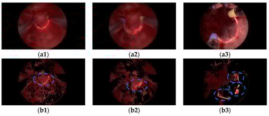 (a1–a3) Original images that consist of the blood and red light. (b1–b3) Image processing results using the hue, saturation, and value (HSV) color space analysis method.