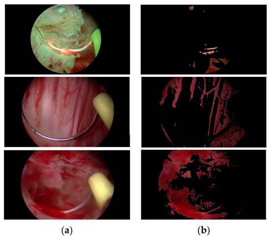 The example of the bleeding areas by the HSV color space. (a) Original image samples with the red and non-red lights. (b) The detection of the bleeding areas.