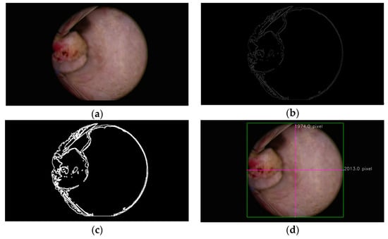 After obtaining the framed images of the TURP surgery without red light distributions, we calculated and classified the bleeding areas to determine the blood loss. Here, the RGB color space was converted to the HSV color space to further detect non-bleeding areas. The example of the bleeding areas is shown in Figure 6. In the original images shown in Figure 6a,b, the bleeding areas were obviously obtained by the HSV color space analysis method. Hence, this method provides the accurate and immediate solution to obtain the bleeding areas [46]. The level of the bleeding areas is considered as the performance indication in surgical diagnosis. To do this, Figure 7 demonstrates the calculation process for prostate occupation as the following successive steps: edge detection image processing, morphology image processing, and bounding box of object for short radius a and long radius b. The ellipse prostate area defined in Equation (1) was calculated by determining the bleeding area ratio (BAR) for the performance indication of the blood loss in prostate surgery.