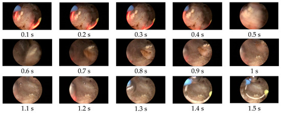 The prostate surgery image datasets were collected at Chang Gung Memorial Hospital using a resectoscope [12], and the pixel resolution data were 3840 × 2160 images used for analyses. The total number of datasets was 26,025 images that recorded the prostate surgery. The dataset ratios of the TURP surgery are listed in Table 3. We split the 1 min surgery into 1735 frames, and each framed image had a 3840 × 2160 pixel resolution. This study utilized 10,410 images of surgical clips for the ResNet-50 model training and validation. The remaining 15,615 frames were used as actual testing datasets. Figure 8 shows the frames captured from a video of the prostate surgery in every 0.1 s. Since the total number of framed images with the red light was less than that with the non-red light, the features of training framed images with the red light were insufficient to constitute a balanced program for training in classification. To achieve a better performance in the training stage, the training datasets were augmented by a geometrical transformation method, for example, flip, rotation, and shift [47]. The details will be described in the following sections.