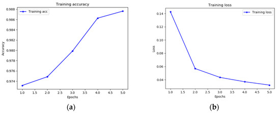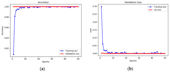 We utilized 10,410 TURP surgery images as training/validation datasets, and the others were used for testing datasets. However, the TURP surgery datasets were difficult to access, and a serious imbalance issue within the datasets in this research could lead to undesirable results. Such an issue could mean that the number of framed images with the red light is inadequate for the training. To solve this problem, a technique of data augmentation could be implemented; thus, we used flip, rotation, and shift to augment the red light images. The respective numbers of the images with the red and non-red lights were prepared to be approximately 3000 for the training. As shown in Table 4, our experimental results are evaluated by the indexes of accuracy, specificity, and sensitivity. Accuracy is the global corrective percentage of classification identification, specificity is the corrective proportion of the image identified without the red light, and sensitivity indicates the corrective proportion of the image identified with the red light. They are defined in Equations (2)–(4), and the definition of the classification metrics is shown in Table 4. Moreover, the following are the definitions of TP, TN, FN, and FP: TP is the number of correctly classified images with the red light, TN is the number of correctly classified images with the non-red light, FN is the number of falsely classified images with the red light, and FP is the number of falsely classified images with the non-red light [48,49]. To validate the performance of the training process, two indicators of training accuracy and loss function are used to evaluate the results of the self-predicted data. The results of the training accuracy and loss function for the ResNet-50 model are both convergent to the best of the fit line, which are shown in Figure 9.