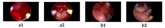 To realize the false classification circumstances, the images of FN and FP in the case of testing the TURP surgery datasets listed in Table 5 were picked for investigation. Figure 10(a1,a2) illustrates the FN images, which reveal that the large dark color blood region is misjudged for the red light pattern. Figure 10(b1,b2) presents the FP images, which reveal that the small red light area is ignored or mistaken for the non-red light image.