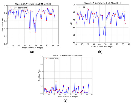 Illustration of the training performance of the model. (a) Dice of coefficient. (b) Intersection over union (IOU). (c) Residual coefficient.