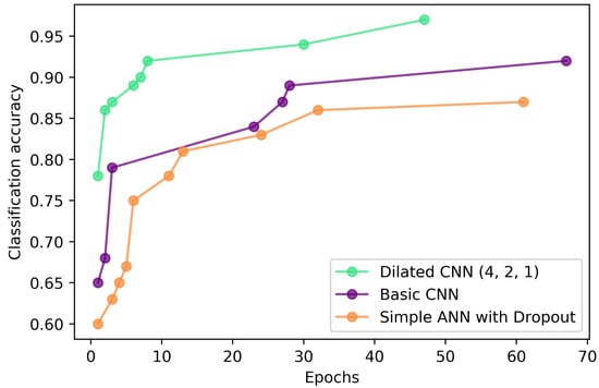 Performance comparison between the best Dilated CNN, Basic CNN and Simple ANN with Dropout architectures with respect to classification accuracy.