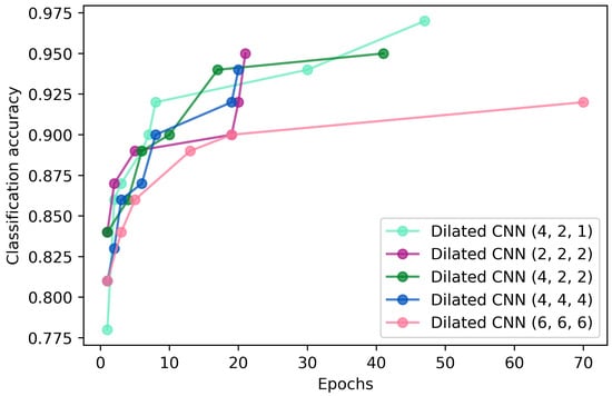 Comparative analysis of various dilation rate parameters based on the maximum validation (classification) accuracy achieved during training.