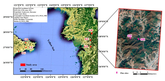 The study area is located in China and South Korea (Figure 1). The study area ranges from an altitude of 100 m–1100 m, comprising a hilly area and regions of flat terrain. Climatologically, it belongs to the north temperate continental monsoon climate, and experiences distinct seasonal variation as well as impacts from the monsoon advancing and retreating. To minimize the influences of undulating terrain and hill shade, six study areas were selected: (CB) mainly cultivated land and built-up areas, (CG) mainly of garden and urban construction land, (CF) mainly cultivated land and forest land, (KB) mainly cultivated land and village construction land, (KE) mainly forest land and river wetland (GDK and GCK Flux sites were in KE region), and (KD) mainly cultivated land and forest land (Figure 1).