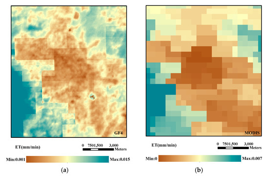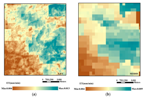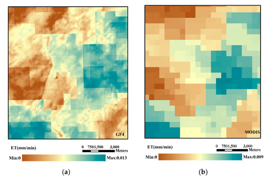 (1) The spatial distribution of ET derived from MODIS and GF-4 showed that the texture of ET derived from GF-4 was more obvious than that from MODIS, and GF-4 was able to express the variability of ET spatial distribution. The correlation between ETs derived from two sensors showed significant linear correlation; and the ET values derived from GF-4 were higher than that of MODIS.