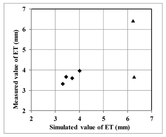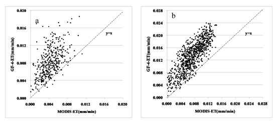 As can be seen from Figure 6 and Table 5, RMSE = 1.04 (mm/day) and the MRE was 16.95% when validating simulated ET values using KoFlux data, which showed that it was feasible to simulate ET using the methods in this paper, while most GF-4 simulated ET values were higher than those of MODIS’s, the MRE of ET when validating GF-4 using MODIS was less than 50%.