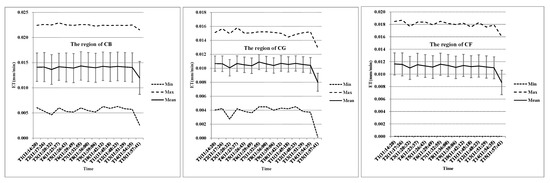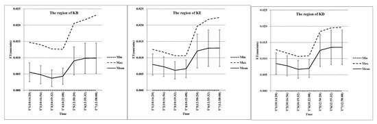 In order to further analyze the variation of ET in all study areas at time T1–T15 in areas CB, CG and CF, in areas KB, KE and KD, the minimum, maximum, and average values, and the standard error of ET at above time was calculated by ArcMAP 10.3 for all pixels, as shown in Figure 7 and Figure 8.