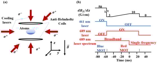 Before being loaded into the narrow-line MOT, atoms need to undergo some pre-cooling stages which force the velocity distribution into the capture range of the narrow-line MOT. A typical MOT configuration is shown in Figure 1a and the corresponding time sequence is shown in Figure 1b for strontium bosons on the ground. Atoms are firstly loaded into a blue MOT where the radiation forces are given by the transition of which is characterized by a 32-MHz natural linewidth and a 461-nm transition wavelength. The R value of this broadline is about , so the gravity can be neglected at this stage. The second stage laser cooling is carried out in a red MOT based on transition of at 689 nm. To make an efficient transfer from blue MOT to red MOT, the 689 nm laser is modulated to be broadband, about 2 MHz, and then changed to be at a single frequency. As mentioned above, the transition has a natural linewidth of kHz, giving a R value of about 16.