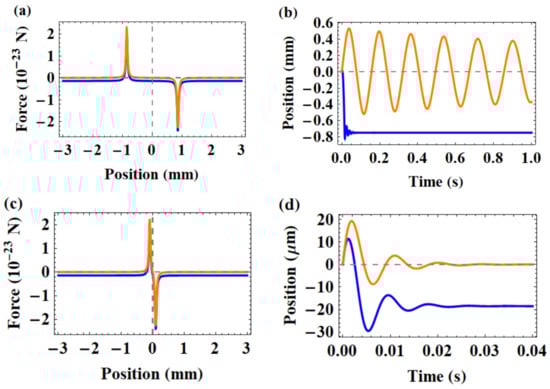 Numerical simulation of the motion of a single Sr atom in the vertical direction driven by mean force in the single-frequency, red MOT. Blue curves correspond to the case on the ground, and orange curves to the case in a -gE (microgravity environments). (a,c) show the mean force of a rest atom depending on location. (b,d) show the evolution of the atom position. (a) and (b) show laser detuning of MHz, while (c) and (d) show kHz.