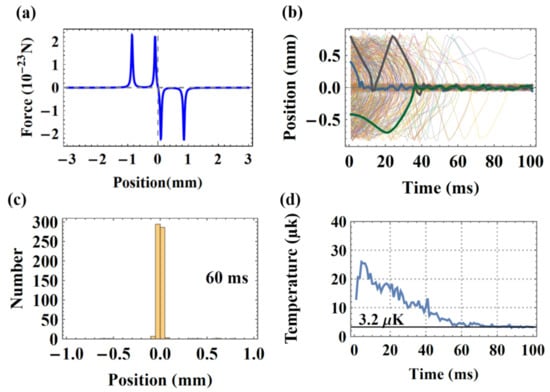 (a) Mean radiation force of a dual-frequency, red MOT depending on position of an atom with zero velocity, supposing a -gE. The dual-frequency consists of one frequency detuned by kHz and one by MHz. (b) Position evolutions of atoms kept inside the MOT. Three cures are randomly selected and thickened to be distinguishable. (c) Position distribution at the time point of 60 ms. (d) Evolution of temperature. The remaining parameters used in this simulation are the same as the ones used in Figure 3.