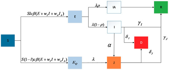 The new dynamic model comprehensively covers the government’s containment measures (lockdown of key epidemic areas, school suspension, and suspension of noncritical production activities) and the classification of infected people (symptomatic and asymptomatic). The model consists of eight objects in the proposed model: susceptible (S), exposed (E), quarantine-exposed (), asymptomatic infected (IA), symptomatic infected (I), diagnosed (J), recovered (R), and dead (D); we call it the SEIR_QJD for short, and the process is shown in Figure 2.