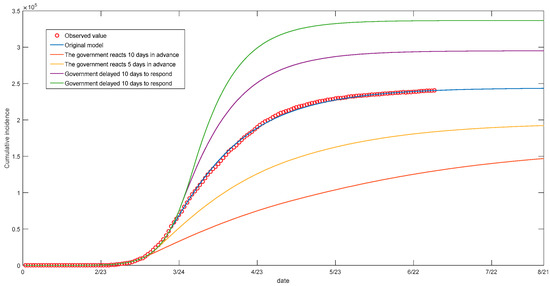 3. COVID-19 is a disease with strong spreading ability, which can be effectively controlled under good public health conditions and quarantine measures. In order to analyze the impact of the government’s response on the epidemic, this paper simulates four different situations by changing the time of the government interventions, which is based on time-varying parameters (Figure 6). The analysis showed that the government’s timely intervention measures could reduce the scale of the disease significantly. This paper only takes Italy’s “closure measures” into account; in practice, it still needs to be comprehensively considered according to the local epidemic situation.