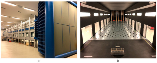 Photographs of the boundary layer wind tunnel (BLWT) at the Leibniz Institute for Agricultural Engineering and Bioeconomy (ATB), Germany. (a) Exterior view of the BLWT viewed from the air inlet; (b) interior view of the test section of the BLWT with the 1:50 scaled pig barn model.