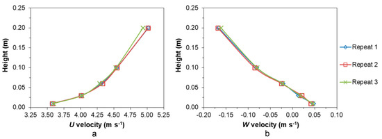 Reproducibility study for air velocity measurements in the wind tunnel without scaled model for free stream wind speed of 8 m·s−1. (a) and (b) represent streamwise (U) and vertical (W) air velocity components, respectively.