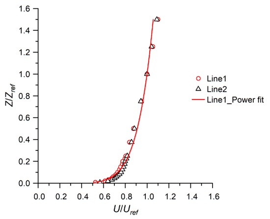 To ensure a stable airflow within the region of interest, wind profiles at the upwind edge of the model (Line1) and the end of downwind airflow measurement region (Line 2) were measured without the scaled model. The vertical profiles of the streamwise air velocity component for Line 1 and Line 2 are compared in Figure 6. The results showed that the two profiles agreed well with each other with an average relative difference of 3.5%, indicating that a stable airflow was achieved within the region of interest.