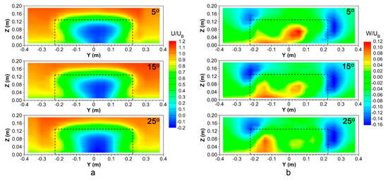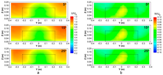 Spatial distributions of (a) streamwise (U) and (b) vertical (W) air velocities normalised by the air velocity at building height (UB) at Plane 2 for roof slopes of 5°, 15°, and 25°. Black dash lines indicate the profile of the scaled model.