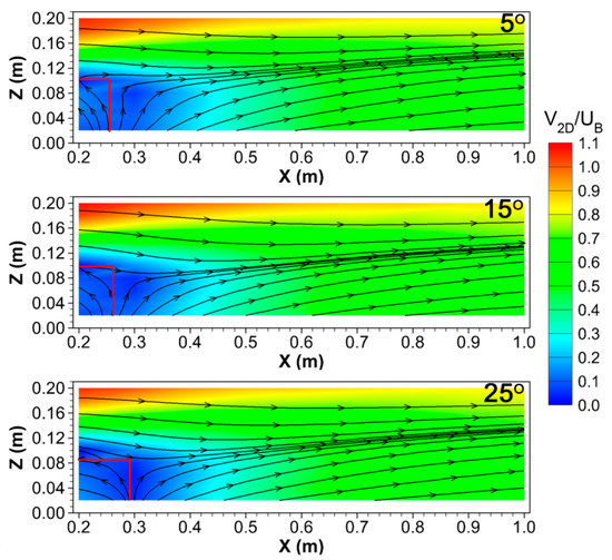 Air streamlines with contours of normalised air velocity magnitude (V2D/UB) at Plane 3 for roof slopes of 5°, 15°, and 25°. UB is the streamwise air velocity at the building height. Red lines indicate the height and length of the wake for each case.