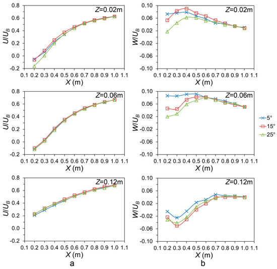 Variations of normalised streamwise air velocity U/UB (a) and vertical air velocity W/UB (b) with respect to the distance from the building (X) at heights (Z) of 0.02 m, 0.06 m, and 0.12 m for roof slopes of 5°, 15°, and 25°. UB is the streamwise air velocity at the building height.