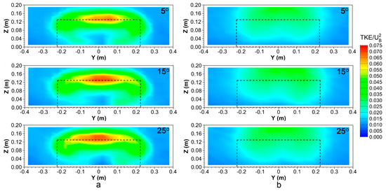Spatial distributions of turbulence kinetic energy (TKE) normalised by the square of the air velocity at the building height () at Plane 1 (a) and Plane 2 (b) for roof slopes of 5°, 15°, and 25°. Black dash lines indicate the profile of the scaled model.