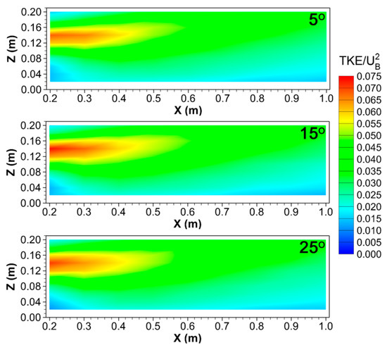 The influences of the roof slope on the air turbulence, denoted by the turbulence intensity (TI) and dimensionless turbulent kinetic energy (TKE/), with respect to the downwind distance from the building (X) at heights (Z) of 0.02 m, 0.06 m, and 0.12 m are described in Figure 13. A considerably higher TI was found at X of 0.2 m–0.4 m for Z of 0.02 m and 0.06 m, where the air vortex was formed in the wake as depicted in Figure 9. The highest TI was observed in the most downward roof structure (i.e., roof slope of 25°), which was attributed to an enhanced disturbance of the roof to the airflow. At Z of 0.12 m, the TI had lower values compared with Z of 0.02 m and 0.06 m, and decreased slowly with distance from the building. The influence of the roof slope on the TI was negligible when the distance from the building exceeded 0.5 m (i.e., 3.8ZB) (Figure 13a). The highest TKE/ occurred at Z of 0.12 m and decayed gradually away from the building. Even though the roof slope had a big impact on the TI, no notable differences were observed among different roof slope cases for TKE/, indicating that the variations in the leeward roof slope might have little influence on the turbulent kinetic energy of the airflow downwind the building. The same TKE/ values for different cases implied that the velocity fluctuations, as explained by Equation (3), were not affected by the roof slope. However, the velocity magnitude (V2D), which was calculated from the U and W velocities (Equation (1)) were affected by the roof slope, as seen in Figure 10. According to Equation (2), TI was calculated as the ratio of the square root of TKE to V2D. Therefore, different TI values were observed among different roof slope cases although the same TKE/ occurred.
