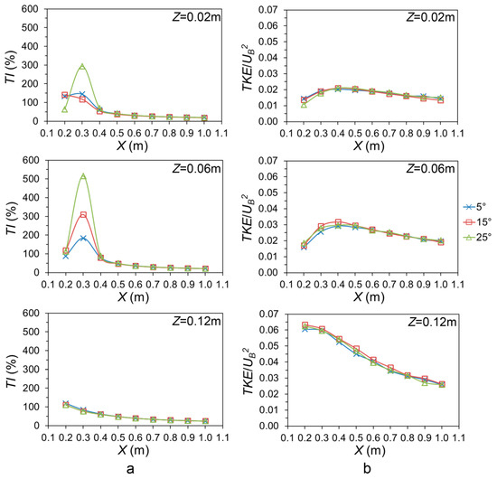TI (a) and TKE/ (b) variations with respect to the distance to the building (X) at heights (Z) of 0.02 m, 0.06 m, and 0.12 m for roof slopes of 5°, 15°, and 25°.