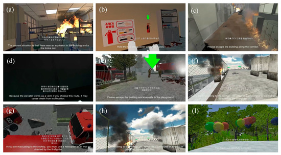People are very likely to feel fear or anxiety in dangerous environments like fire sites [41]. Even if a fire site is only virtually displayed, the learner is more likely to feel anxiety when the virtual experience feels too real. Therefore, the fire safety education game that was used in a previous study [10] was used for the VR content and systems in this study. The gameplay video can be found in Video S1 (see the Supplementary Materials).