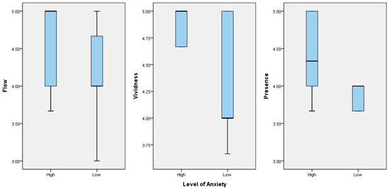 Comparison of the boxplots for the high- and low-anxiety groups for the flow, vividness, and presence variables while playing the fire safety education VR game with cutaneous sensation.
